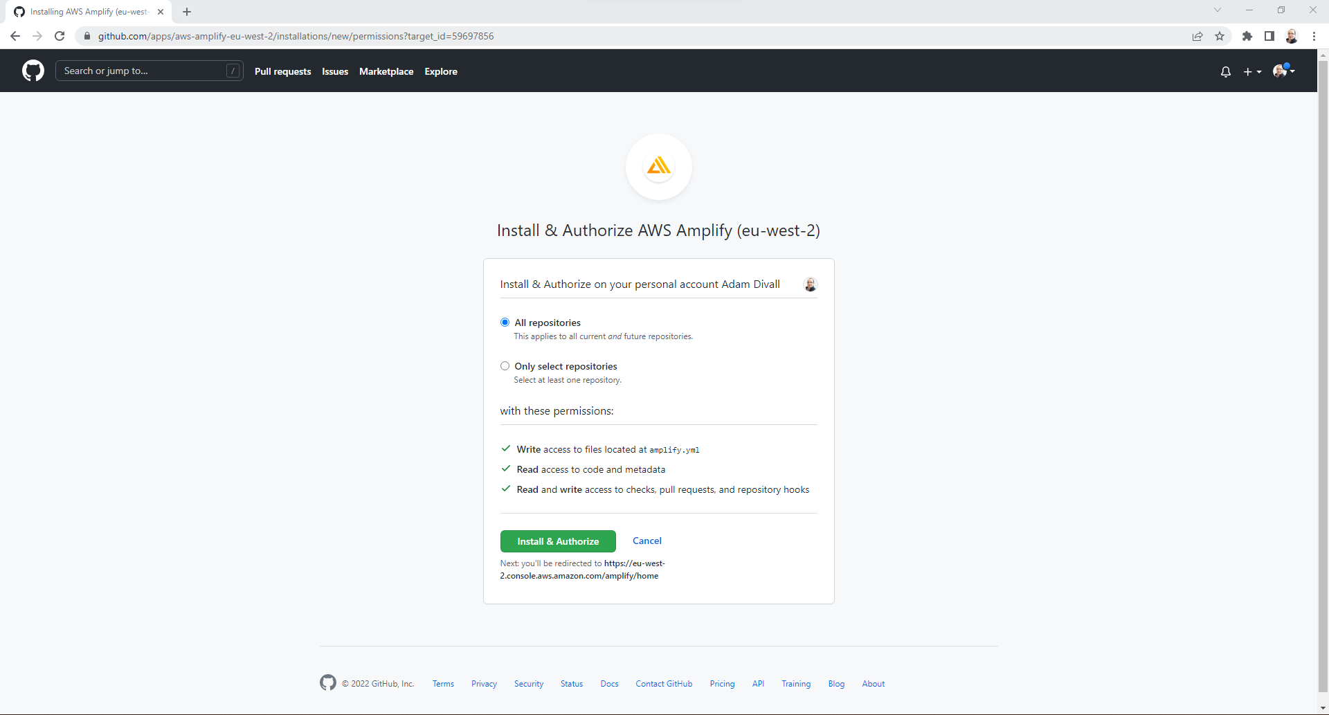 - On the Install & Authorize AWS Amplify page, Choose Only select repositories, and Select the Repositories that you want to provide AWS Amplify with access too and then Click Install & Authorize.